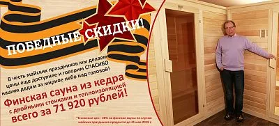 В честь майских праздников мы делаем цены на финские сауны еще доступнее и говорим СПАСИБО нашим дедам за мирное небо над головой!