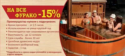 • Акция действует на все изделия из дерева, кроме бань-бочек, бондарной продукции, офуро, душевых кабин и мебели.