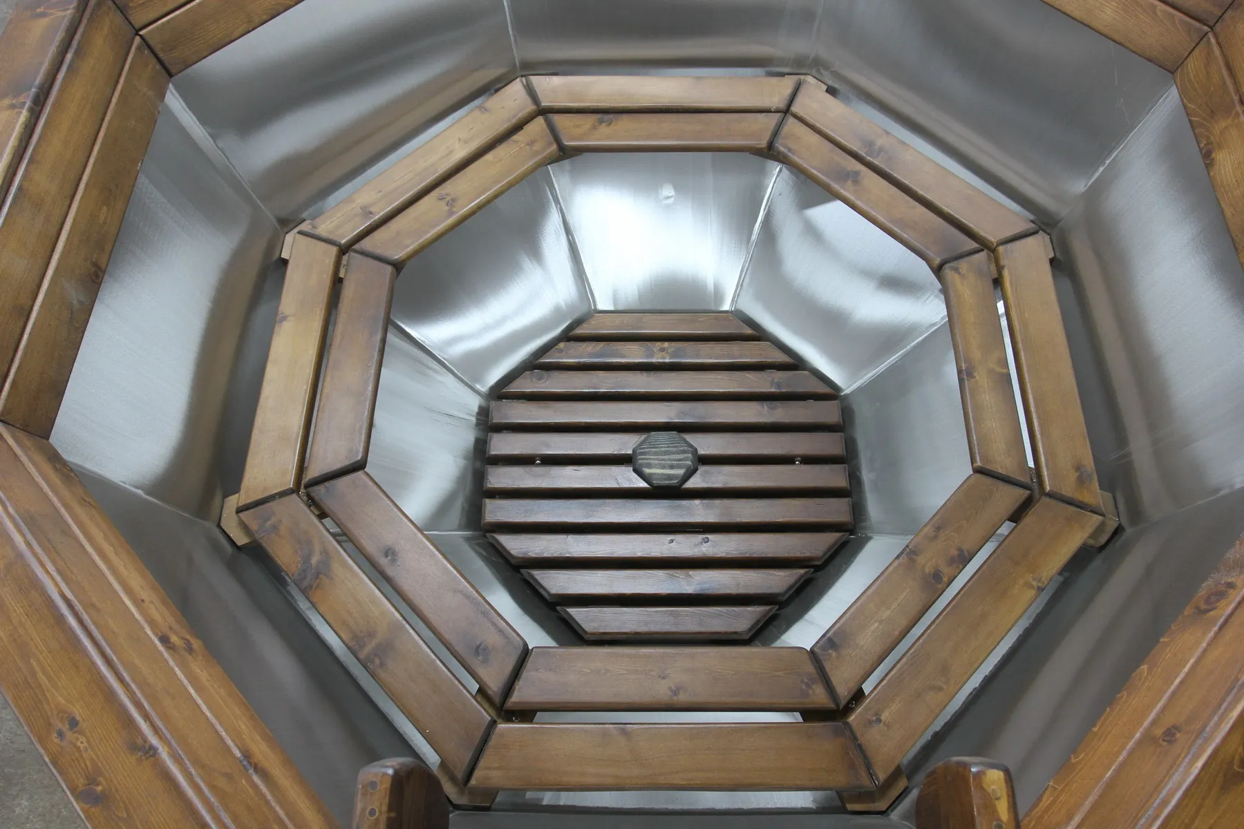 Банный чан с ветрозащитой изготовлен из пищевой стали. Представляет собой большую ёмкость в виде чаши, при нагревании которой можно париться на свежем воздухе. Банный чан установлен на металлическую закрытую подставку, которая служит защитой от ветра и печью одновременно. В комплект такой модели входит дымоход 2 метра. Чан оборудован кедровым бортом, скамейками, подспинниками, трапом для ног и приставной лестницей.