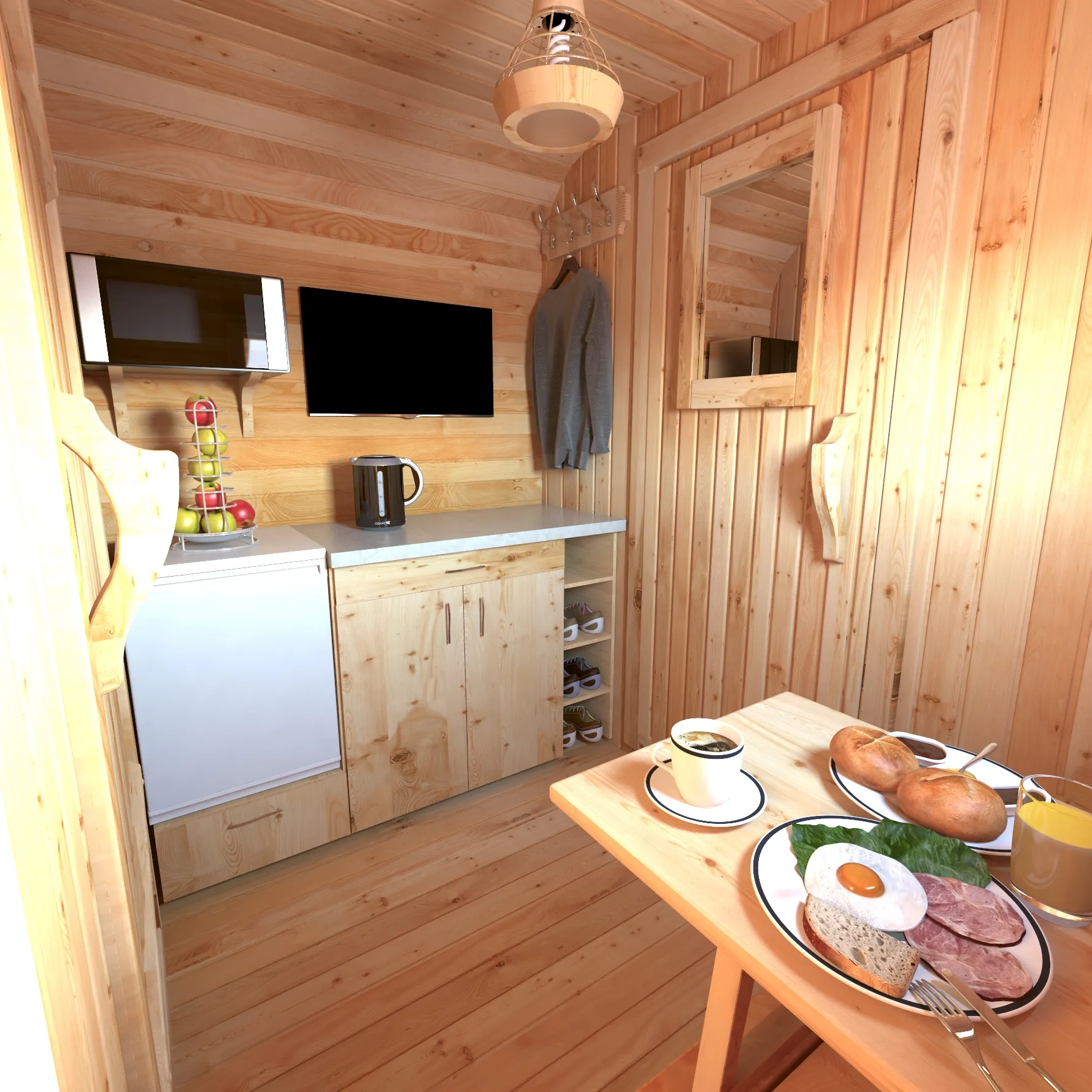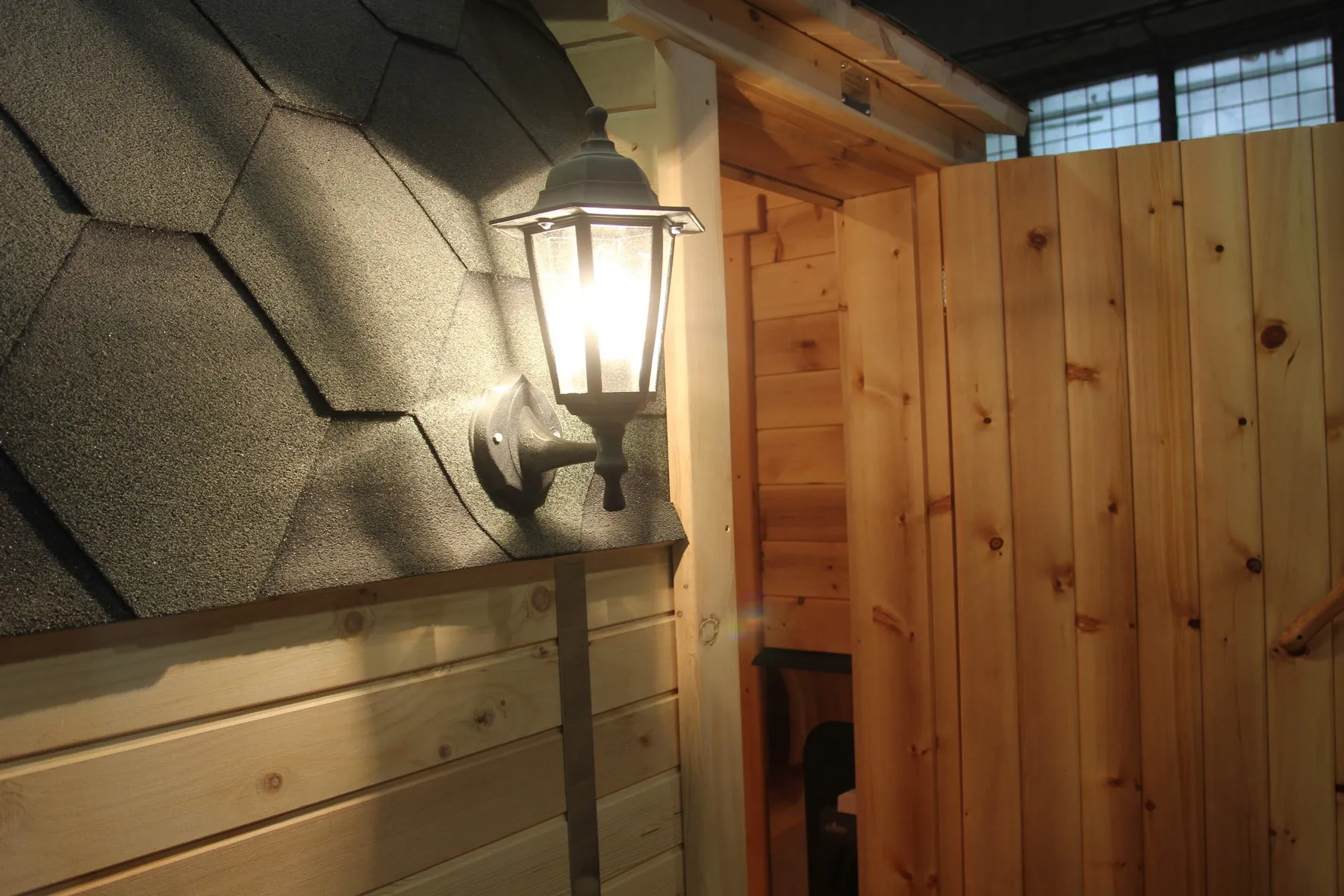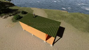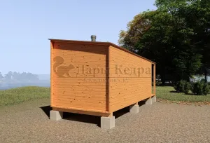 Это классическая прямоугольная модель бани с двумя отделениями: предбанником и парилкой, а так же удобной терассой. Предбанник оснащен лавочкой и вешалкой. Парилка оборудована двухуровневым открытым полком и печью. Время растопки такой бани не превышает 30 минут. Каркасно-щитовую баню можно заказать как в готовом, так и в разборном варианте. В разборной модели готовые щиты из кедра быстро собираются в полноценное строение, что также позволяет исключить лишний строительный мусор. Такая баня не требует полноценный фундамент, поэтому при необходимости ее можно перенести в другое место.