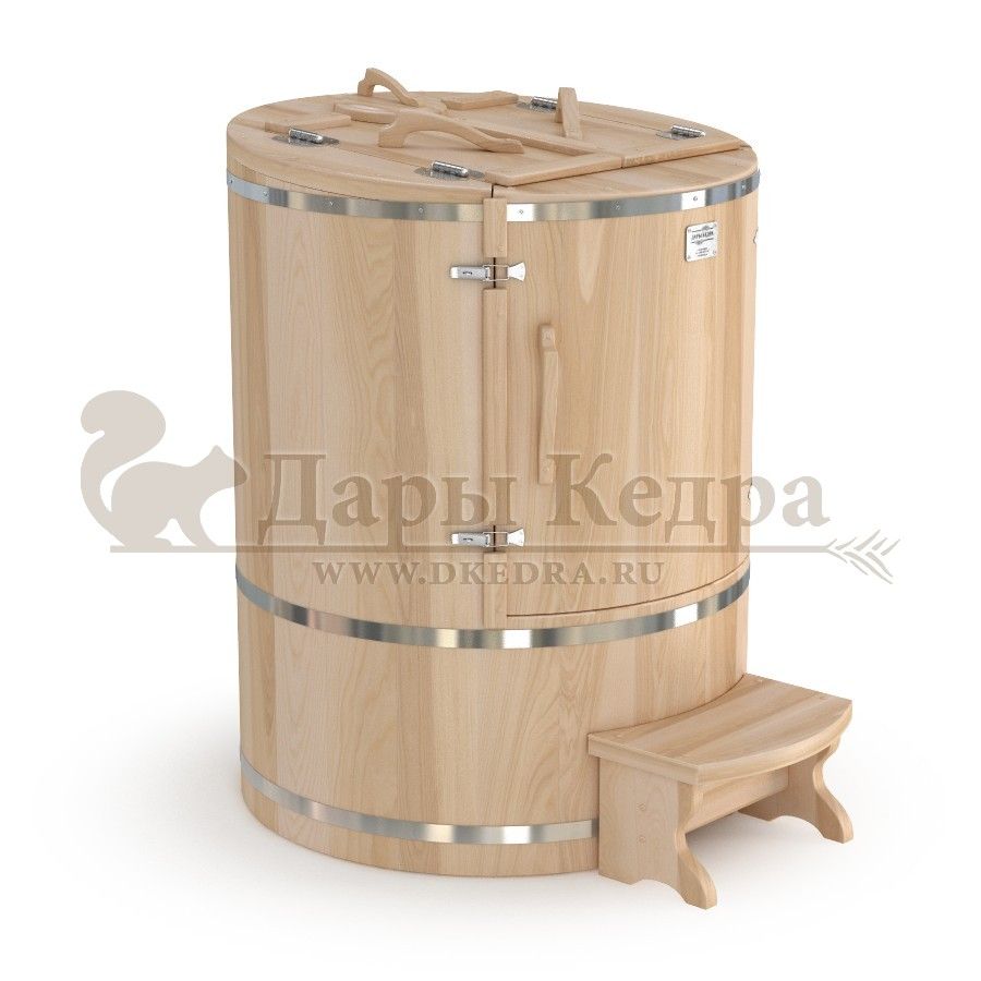 Готовый комплект «Удобный+»: кедровая бочка с парогенератором + био-защита изнутри и снаружи Готовый комплект - это полностью укомплектованный набор с фитобочкой для процедур парения. Овальная модель более просторна и удобна в использовании. Толщина стенок составляет 25 мм. Бочка оборудована откидными створками, дверцей и отверстием для головы. Верхний скос изделия делает положение головы более комфортным и улучшает обзор. Во время парения человек сидит внутри кедровой бочки, а голова находится снаружи. Благодаря этому исключается возможность перегрева. Подлокотники из кедра, встроенные ручки на створках и двери делают эксплуатацию более удобной. Парение в фитобочке благотворно влияет на организм в целом: повышается иммунитет, выводятся шлаки и токсины, улучшается работа органов тела и состояние кожи.