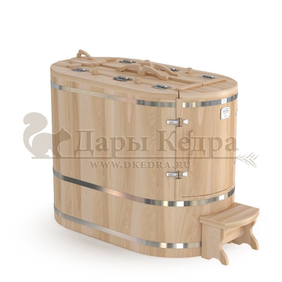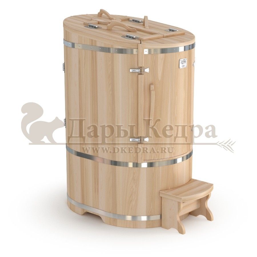 • Кедровая бочка (фитобочка) овальная со скосом «Профессиональная» Овальная фитобочка из кедра - это мини парная, которую можно использовать не только в спа-салонах, но и дома. Овальная модель более просторна и удобна в использовании. Толщина стенок составляет 40-45 мм, что позволяет увеличить срок службы изделия. Верхний скос делает положение головы более комфортным и улучшает обзор. Она оборудована откидными створками, дверцей и отверстием для головы. Во время парения человек сидит внутри кедровой бочки, а голова находится снаружи. Благодаря этому исключается возможность перегрева. Подлокотники из кедра, встроенные ручки на створках и двери делают эксплуатацию более удобной. Парение в фитобочке благотворно влияет на организм в целом: повышается иммунитет, выводятся шлаки и токсины, улучшается работа органов тела и состояние кожи.