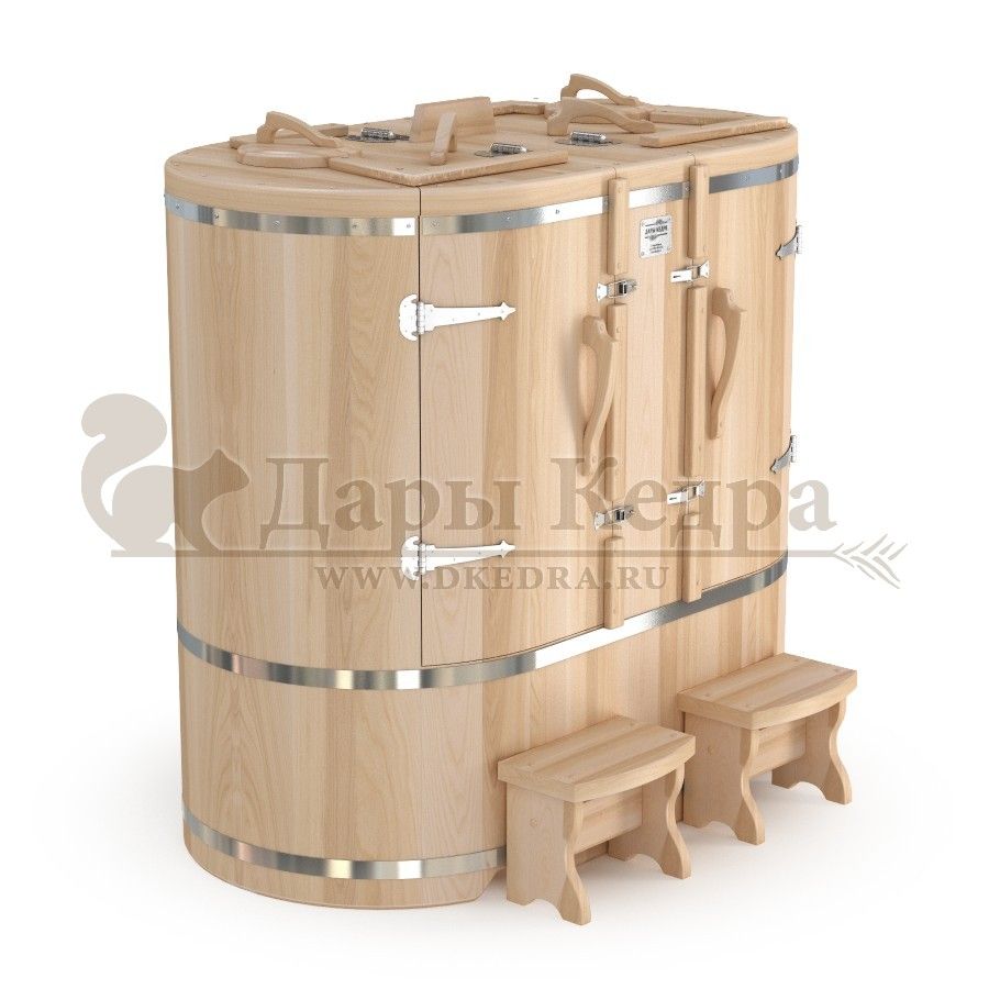 • Кедровая бочка (фитобочка) двухместная «Профессиональная» Двухместная фитобочка из кедра - это парная, в которой удобно принимать процедуры двум людям. Она оборудована откидными створками, дверцей, отверстием для головы и перегородкой (по желанию). Толщина стенок составляет 40-45 мм, что позволяет увеличить срок службы изделия. Во время парения человек находится внутри кедровой бочки, а голова снаружи. Благодаря этому исключается возможность перегрева. Подлокотники из кедра и внутренние ручки делают эксплуатацию фитобочки более удобной. Парение в фитобочке благотворно влияет на организм в целом: повышается иммунитет, выводятся шлаки и токсины, улучшается работа органов тела и состояния кожи.
