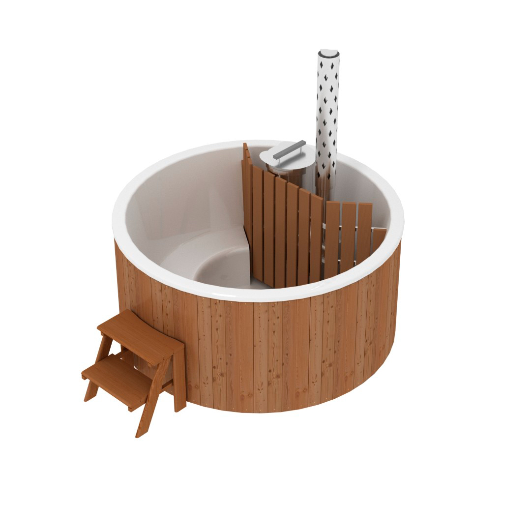 • Финская круглая композитная купель с подогревом (с печкой) «Премиум 220 40 квт» Это уличная подогреваемая купель с круглой внутренней чашей, которая изготовлена из современного прочного и термоустойчивого материала (композита). Форма чаши обеспечивает комфортную посадку во время принятия процедур. Для удобства пользования купель фурако оборудована приставной лестницей. Нагрев воды осуществляется за счет встроенной печи, которая находится внутри купели за перегородкой из кедра. В комплектацию этой модели входит савок с длинной ручкой, который позволяет извлекать угли после эксплуатации изделия. Композитная вставка придает купели красивый внешний вид, продлевает срок службы и облегчает уход за изделием. Парение на свежем воздухе – это отличный способ укрепить здоровье и поддержать организм в тонусе.