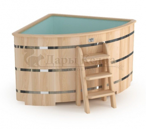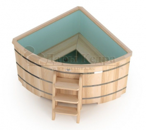 Это треугольная емкость для воды с пластиковой чашей. Она предназначена для отдыха и охлаждения тела после банных процедур. Купель устанавливается в угол помещения, что идеально для не больших пространств. Так же подходит для уличного использования. Угловая купель с пластиковой вставкой оснащена лавочками, приставной и внутренней лестницей из кедра.