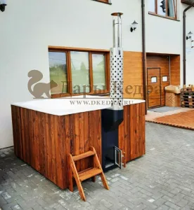 Это купель с квадратной внутренней чашей, которая изготовлена из современного прочного и термоустойчивого материала (композита). Форма чаши обеспечивает комфортную посадку внутри изделия. Для удобного использования купель оснащена приставной лестницей. Обручи из нержавеющей стали декорируют купель с композитом и равномерно распределяют нагрузку во время процедур.