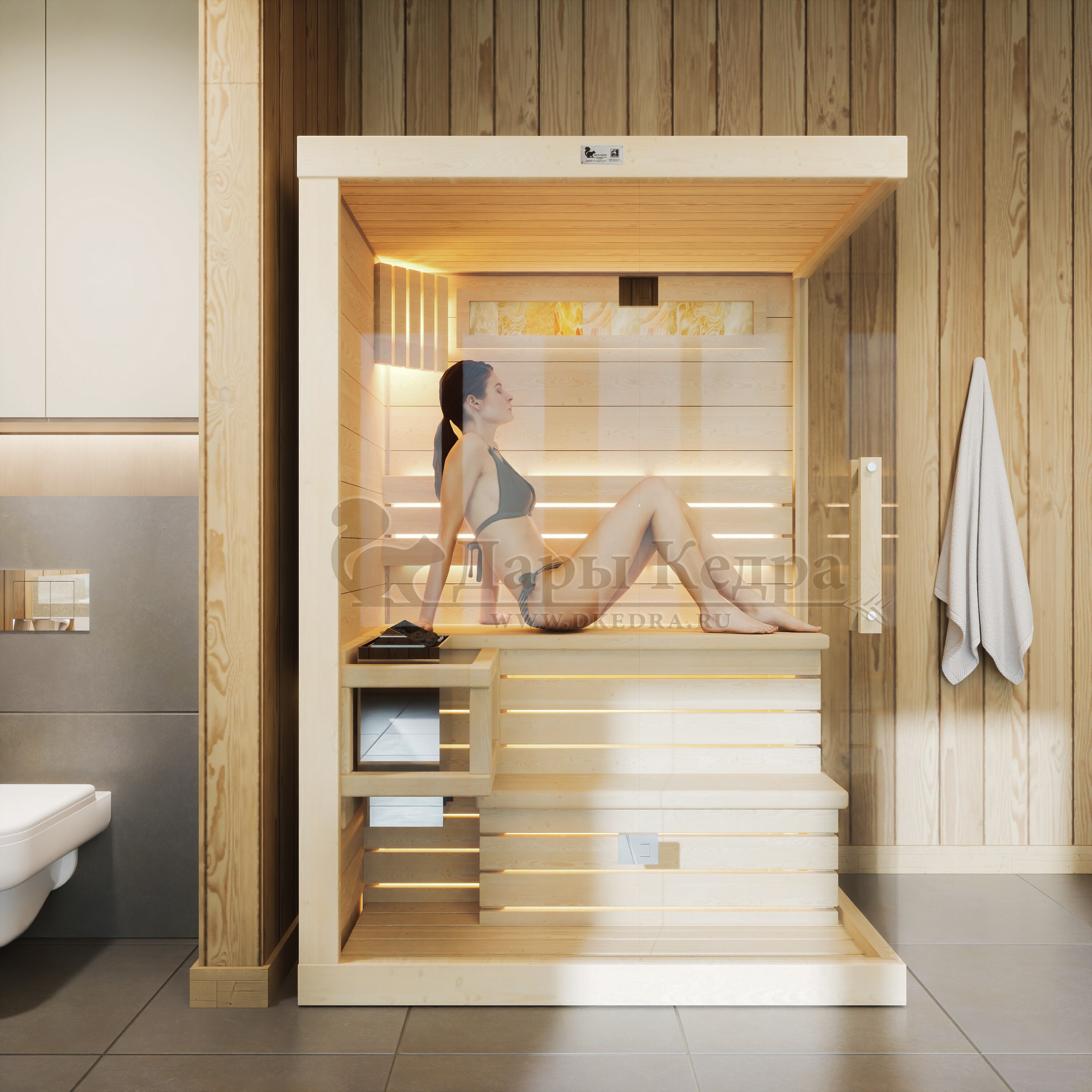 Финская сауна с электрокаменкой представляет собой компактную парную кабину, изготовленную из целебной древесины сибирского кедра. Финская
